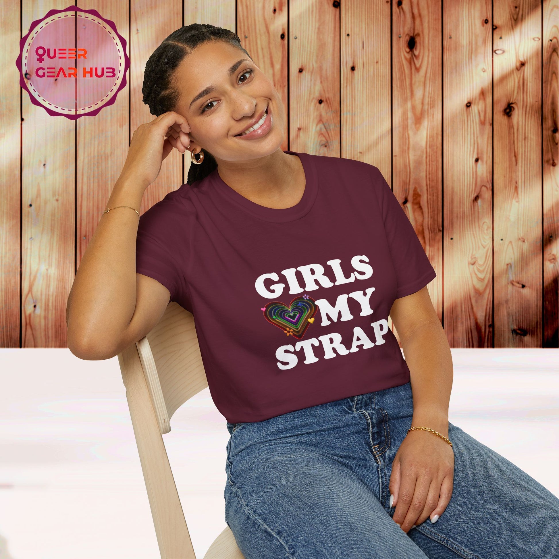 Funny Pride T-Shirt for Lesbians, Bisexuals, Gays & Queers - "Girls Love My Strap" 2SBIPOC LGBTQIA+ Pride Unisex Tee, Perfect Pride March Shirt, GEN Z humor